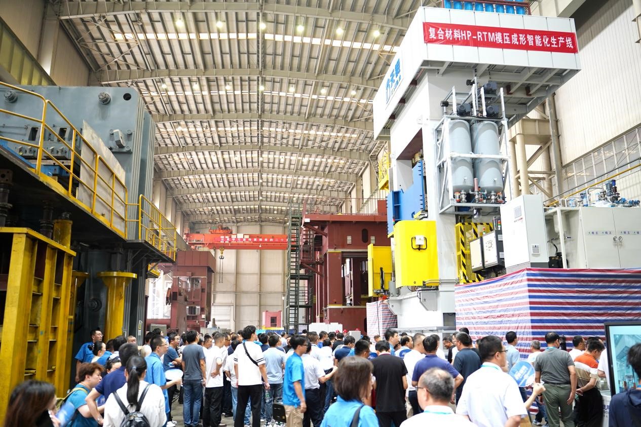 大會期間,嘉賓們參觀了天鍛公司工廠,詳細了解了天鍛公司生產(chǎn)的HP-RTM復(fù)合材料壓機模壓生產(chǎn)線,觀看了自動化生產(chǎn)線模型演示畫面,該產(chǎn)線可用于生產(chǎn)碳纖維或玻璃纖維為基材的各類產(chǎn)品,包括新能源汽車電池盒上蓋。通過參觀嘉賓們對公司近年來復(fù)合材料產(chǎn)品的性能和技術(shù)進步情況有了全面了解。