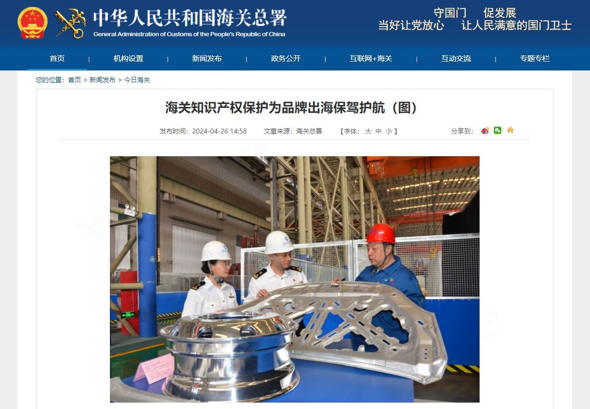 4月26日,中華人民共和國(guó)海關(guān)總署官網(wǎng)刊登了《海關(guān)知識(shí)產(chǎn)權(quán)保護(hù)為品牌出海保駕護(hù)航》一文http://www.customs.gov.cn//customs/xwfb34/302425/5842240/index.html ,重點(diǎn)介紹了通過知識(shí)產(chǎn)權(quán)海關(guān)保護(hù),助力公司茁壯發(fā)展。