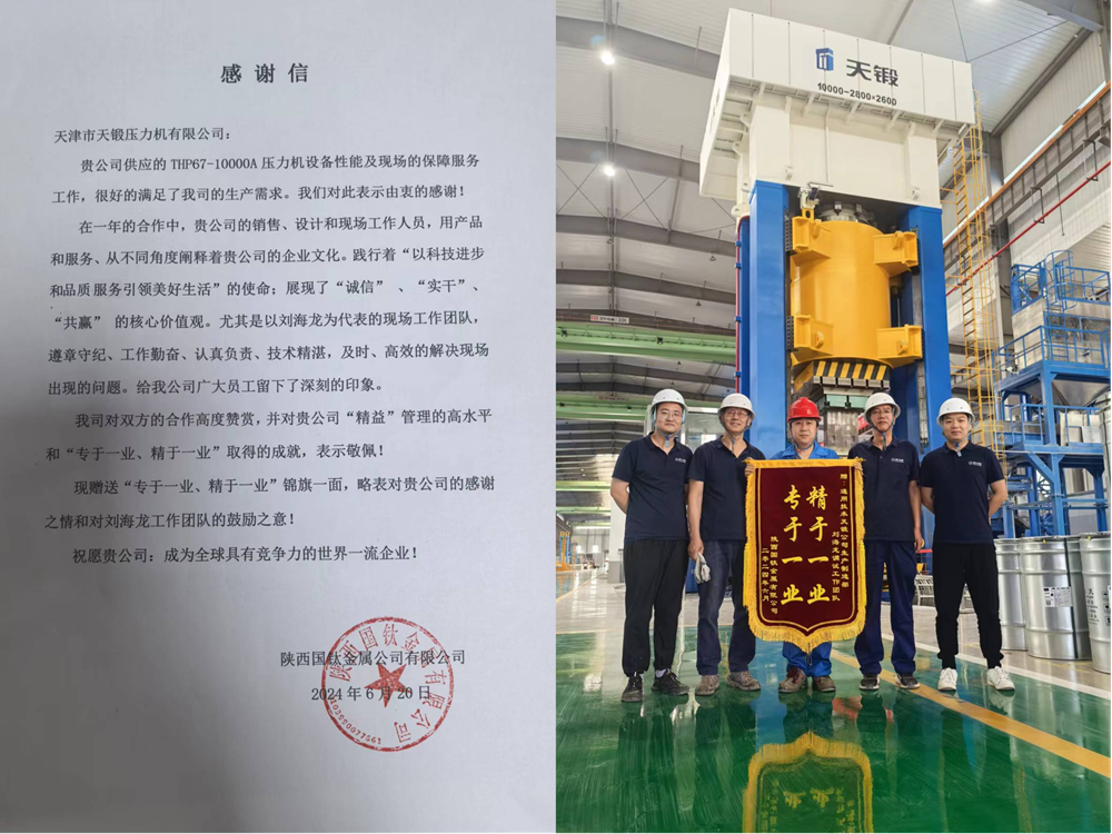 6月,陜西國鈦金屬有限公司、寶雞通潤金屬材料有限公司、江陰恒潤股份有限公司提出設(shè)備保養(yǎng)需求,希望公司派專業(yè)技術(shù)人員到現(xiàn)場指導(dǎo)一次設(shè)備的點檢,確保訂單按期交付。生產(chǎn)制造部專業(yè)技術(shù)人員劉海龍、宋志業(yè)、李曉平、梁旭峰、賀浩、孫博磊積極與客戶溝通,利用各自項目空檔時間分別去往不同的客戶現(xiàn)場,對設(shè)備運(yùn)行精度、設(shè)備壓力、系統(tǒng)穩(wěn)定運(yùn)行等多方面進(jìn)行點檢和培訓(xùn)。客戶對公司技能人員的專業(yè)水平和敬業(yè)精神高度贊賞,致以感謝信和錦旗。