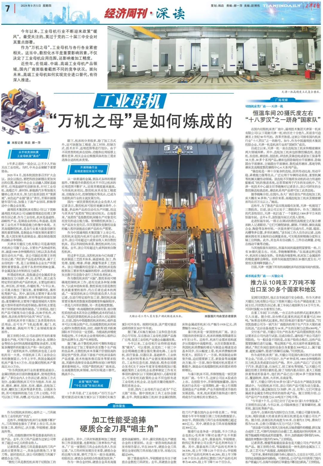 9月5日,《天津日?qǐng)?bào)》“經(jīng)濟(jì)周刊”整版刊發(fā)《工業(yè)母機(jī) “萬(wàn)機(jī)之母”是如何煉成的》一文。文章聚焦“工業(yè)母機(jī)”,以政策“暖風(fēng)”扶持為切入點(diǎn),展示了通用技術(shù)機(jī)床公司及其所屬天鍛公司作為中央企業(yè)被賦予的使命擔(dān)當(dāng)。